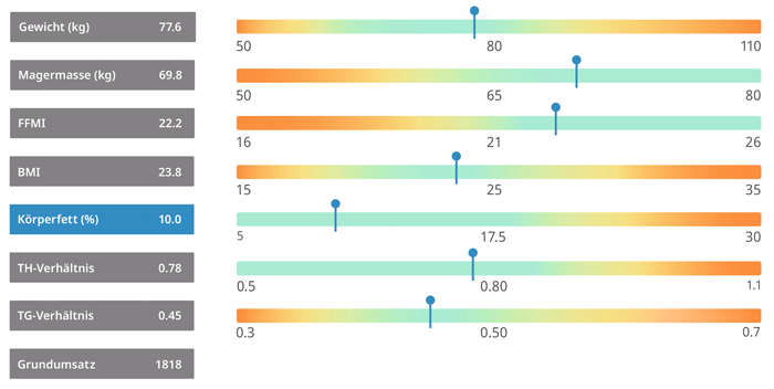 Der Bodyscan liefert dir zentrale Körperdaten wie Gewicht, Körperfettanteil, BMI, fettfreie Masse, den fettfreien Masse-Index sowie deinen Grundumsatz. Zusätzlich wird das Viszeralfett anhand der Verhältnisse Taille zu Hüfte und Taille zu Körpergröße bewertet.